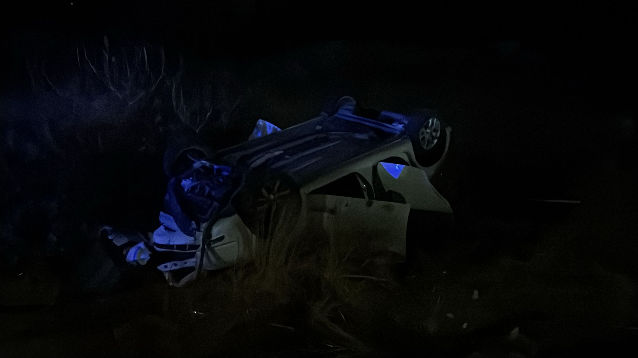 Çarpmanın etkisiyle savrulan YH 060 plakalı araç, yolun solundaki bordür taşlarına çarptıktan sonra takla atarak toprak alanda tavanı üzerinde durdu.